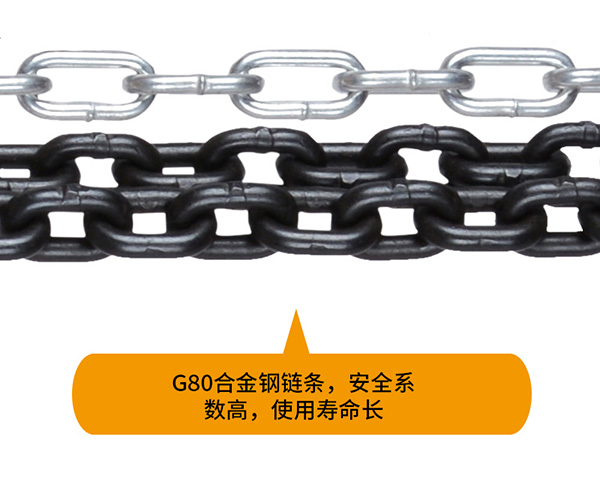 ● 采用80級(jí)高強(qiáng)度起重鏈條,安全系數(shù)高,使用壽命長(zhǎng)