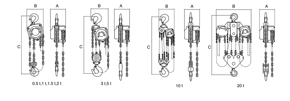 型號(hào) | 額定載荷(t) | 起升高度(m) | 試驗(yàn)載荷(KN) | 手拉力 (N) | 起重鏈條 | 尺寸規(guī)格(mm) | 重量(kg) | ||||