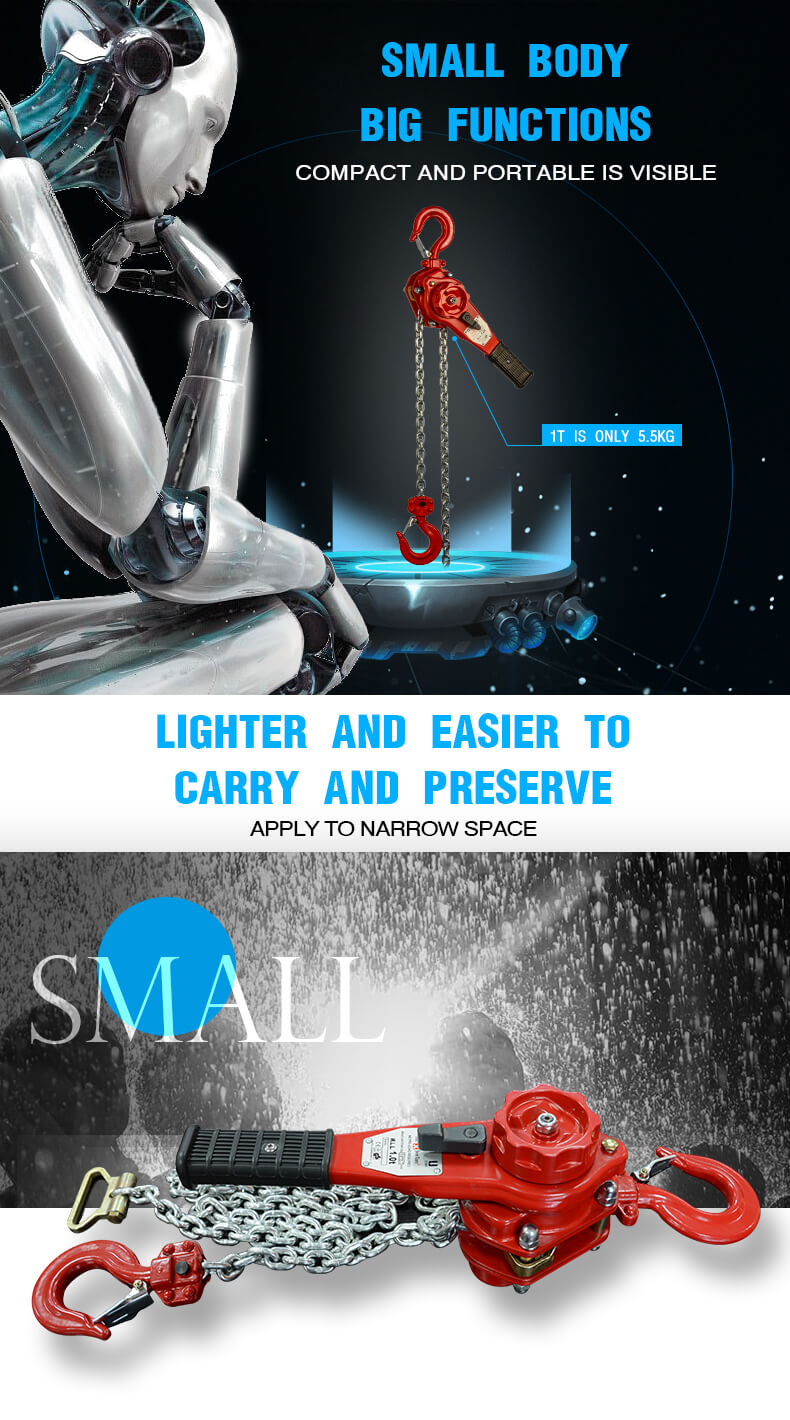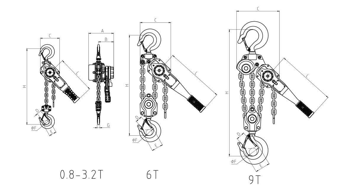 型號(hào) | 額定載荷(t) | 起升高度(m) | 試驗(yàn)載荷(t) | 手板力 kg(n)(ibs) | 起重鏈條 | 尺寸規(guī)格(mm) | 重量(kg) | |||||||||