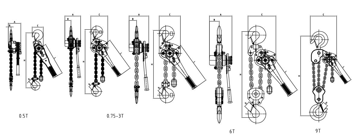 Model | W.L.L(t) | LIFT(m) | Proof Load(KN) | Lever Force kg(n)(ibs) | Load Chain | Dimensions(mm) | N.W.(kg) | ||||||