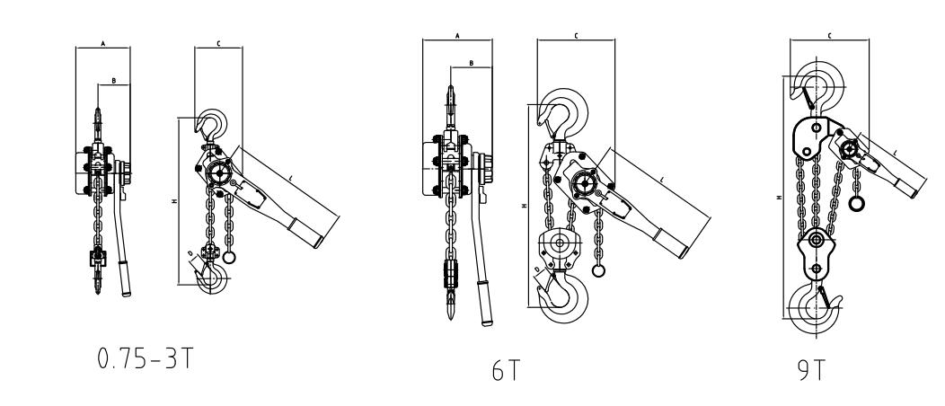 型號(hào) | 額定載荷(t) | 起升高度(m) | 試驗(yàn)載荷(t) | 手板力 kg(n)(ibs) | 起重鏈條 | 尺寸規(guī)格(mm) | 重量 | ||||||